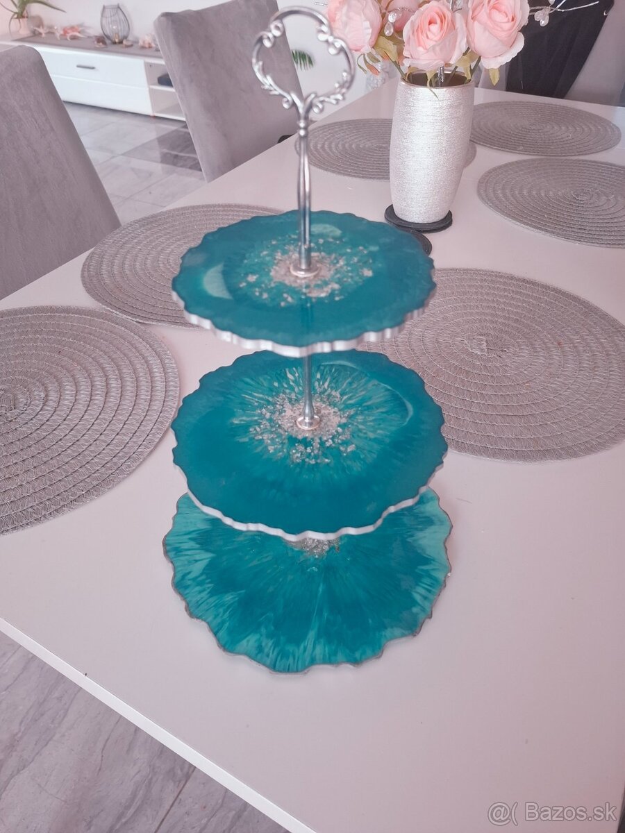 Krasny iba pár krát použitý ručne vyrobený etazer so živice, tri poschodia, krasna tyrkysová farba,keďže som farebné menila domacnost ,nehodí sa mi,iba stojí v skrini
