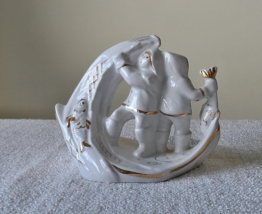 Ponúkam na predaj zaujímavé súsošie rybárov. Stará ruská keramika. Žiaľ značenie je už nečitateľné. Výška 13 cm, dĺžka 16 cm, šírka 10 cm. Pekný, zachovalý stav. Cena 15 € plus poštovné. Preferujem platbu vopred na účet. Ďakujem.