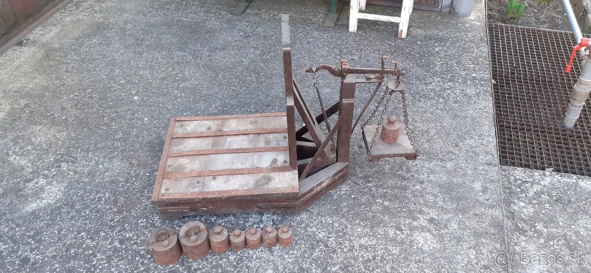 Ponúkam na predaj drevenú váhu v zachovalom stave so závažiami (2x5kg, 2x2kg, 4x1kg); rozmery váhy: dĺžka 96cm, výška 72cm, šírķa 47,5cm. Nosné želežné oko stratené, nahradené reťazou.