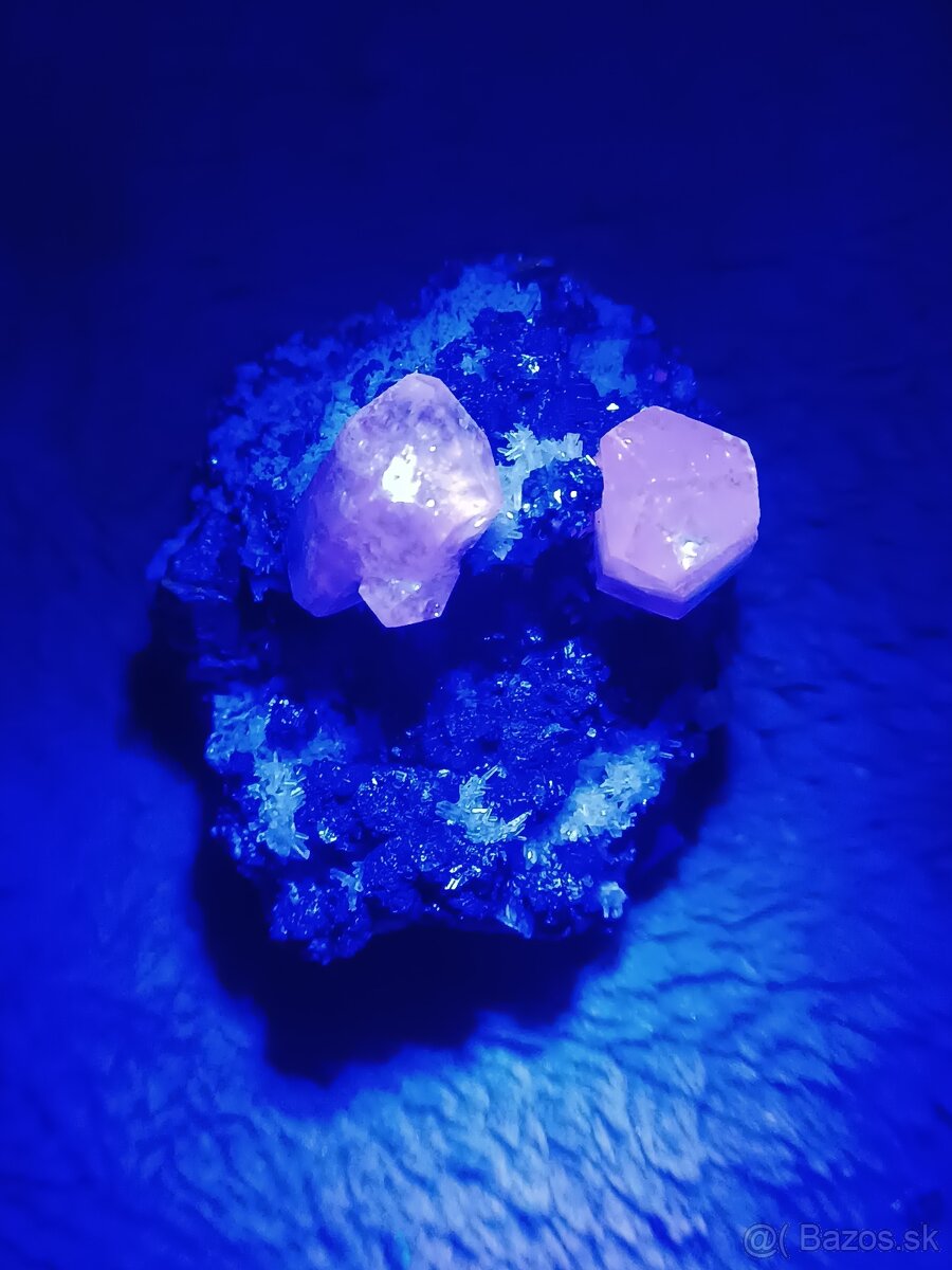 Malá,veľmi lesklá vzorka plná pyritu,kremenných kryštálikov a dvomi kalcitmi- ktoré sú UV aktívne a krásne svietia na ružovo. V skutočnosti svietia krajšie ako na fotke.