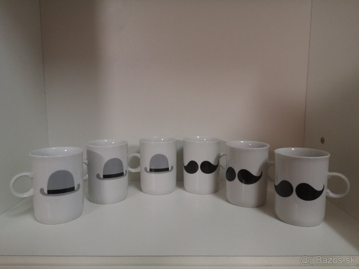 Retro, porcelánové šálky, 6 kusov. Stav dobrý, bez oťukov, nepoužívané. Netradičný, malo vídaný vzor fúzov a klobúka. Rozmery: 8,5 cm x 6 cm.