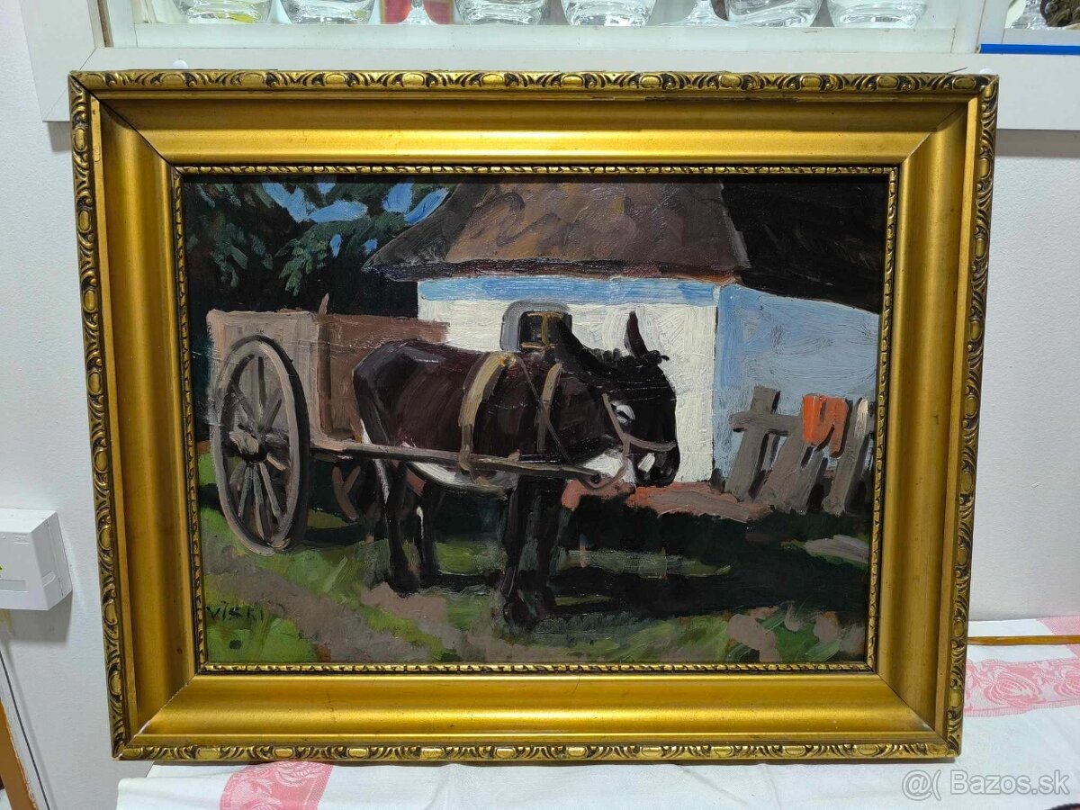 Predám krásny starý obraz Osli záprah od významného maďarského maliara Jánosa Viskiho.Olejomalba na kartone v ráme rozmer bez rámu 50 x 37 cm, signovane, cena 220 eur plus poštovné