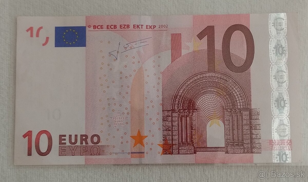 Predám 10 eurovú bankovku prvej série z roku 2002 z obehu, stav viď foto.