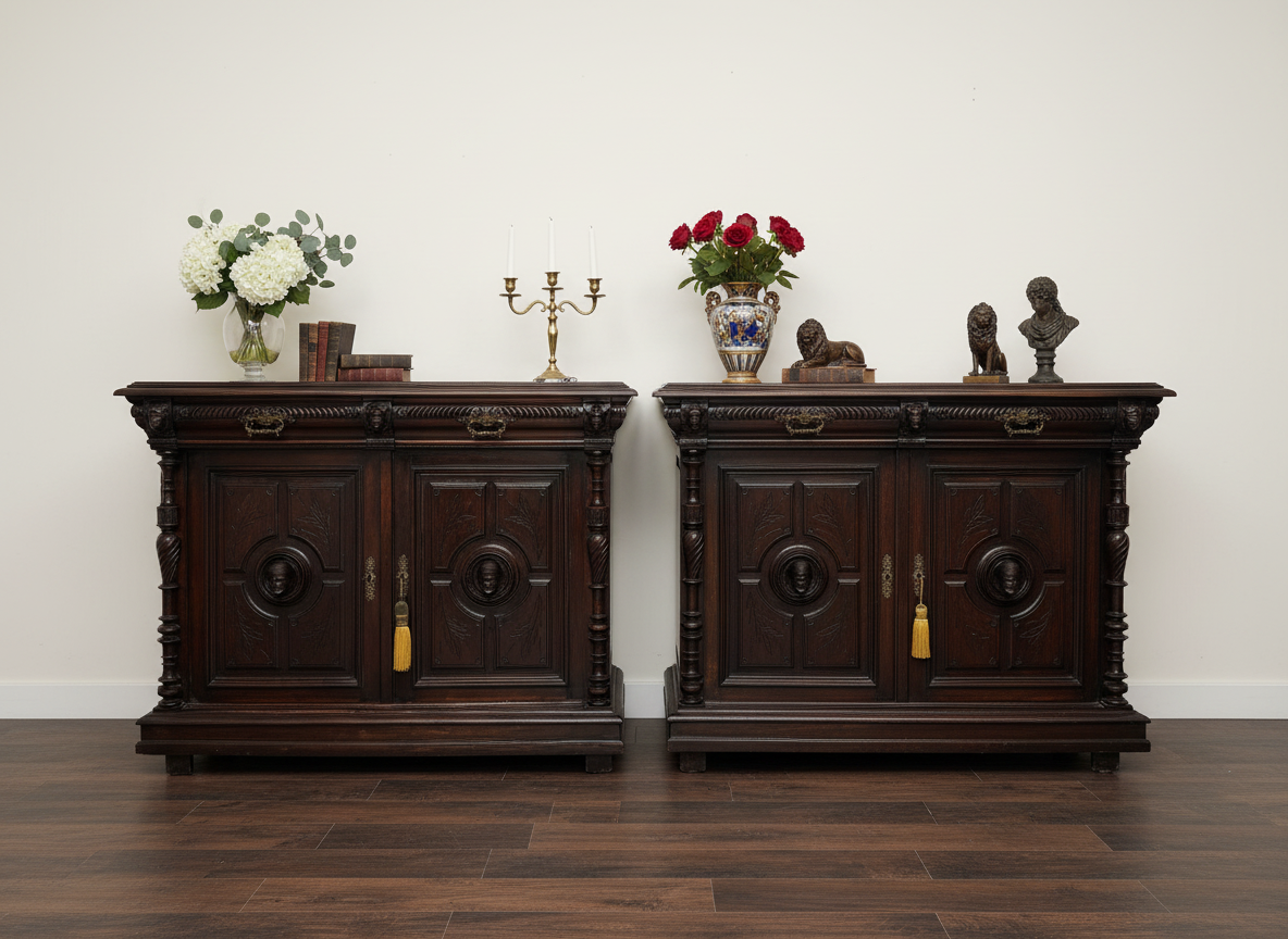 Starožitné masivní skříně Henri II. ● dubové dřevo ● neorenesanční styl ● mosazné kování ● vyřezávané sloupy ● původ Francie ● období historimus ● +- 1900 ● cena za oba kusy