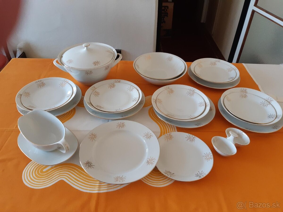 Retro obedová súprava - [5.3. 2026]Predám retro obedovú súpravu značky Thun Czechoslovakia. 1x oválny servir. + 1 veľký okrúhly servírovací tanier, 1x obedová misa, 1x omáčnik, 5x plytký tanier. K tomu darujem veľký plytký tanier, priemer 30 cm.