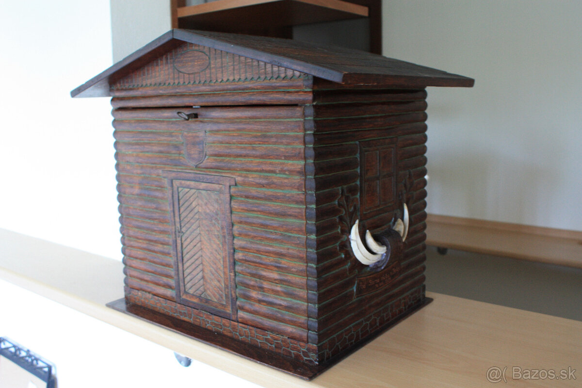 Predám drevený, vyrezávaný poľovnícky bar v štýle horárne. Po stranách sú trofeje z diviaka, vpredu výklopné dvierka, vo vnútri polica na poháre. Rozmer: pôdorys cca 44x44cm, výška 50cm.