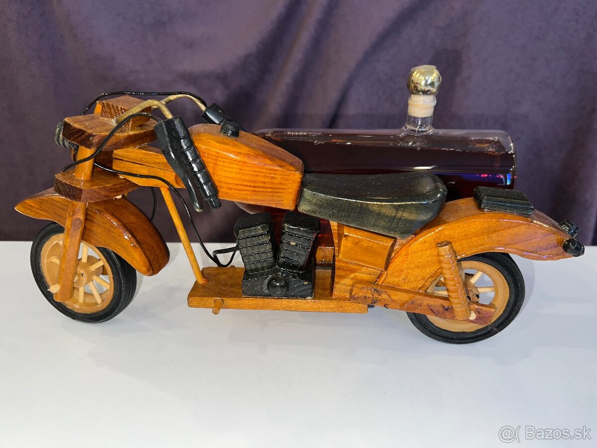 Drevená motorka s integrovanou sklenenou fľašou