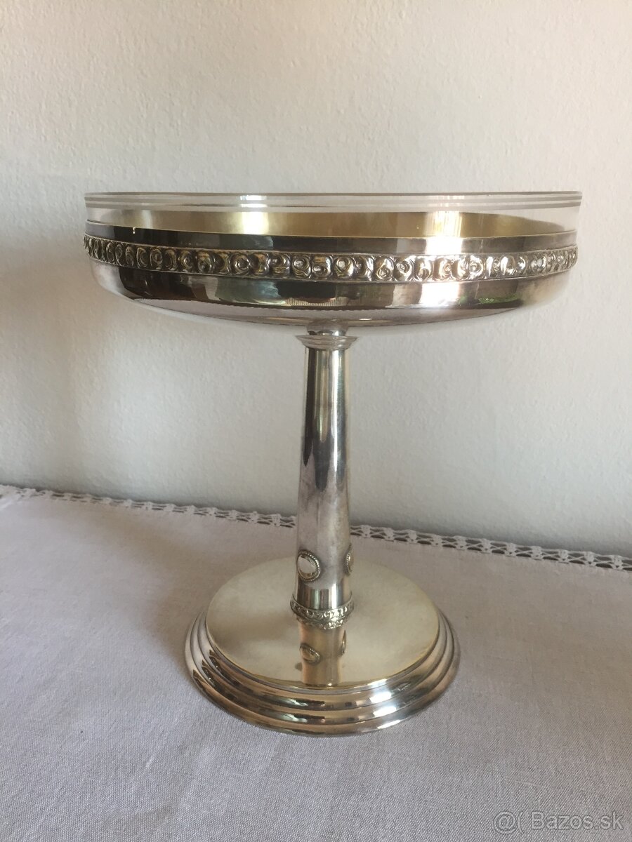 Secesný podnos z alpaky so sklenenou nepoškodenou miskou. Výška 26 cm, priemer 23,5 cm. Špičkový kus.