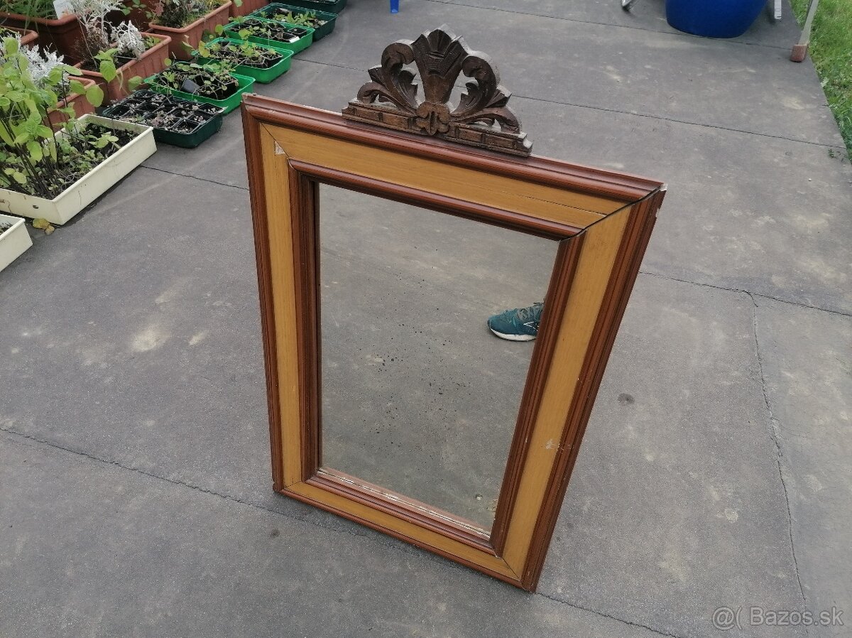 Predám starožitné zrkadlo komplet aj s vrchnou vyrezávanou okrasou. Rozmer 86cm x 51cm. Cena 25€.