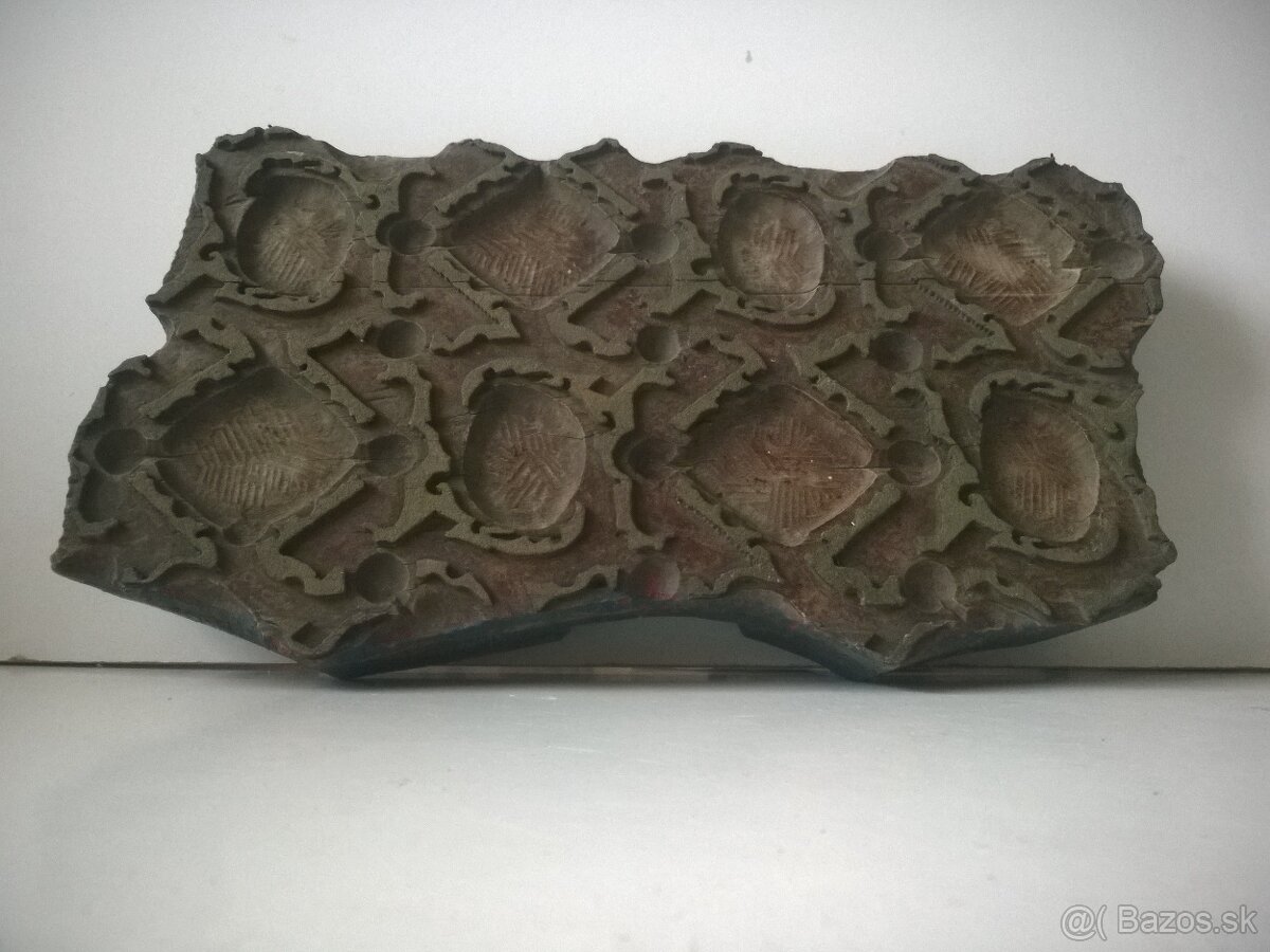 Starožitná celodrevená forma, Ručne vyrezávaná, tvrdšie drevo Pekne zachovaná nepoškodená, Veľký rozmer 40x22 cm. geometrické veľké tvary, všetko staré drevo. Kľudne aj na používanie. Odhadom 120-150 rokov stará. Forma na modrotlač, stará textilná forma -tlač, modrotlačová forma,
