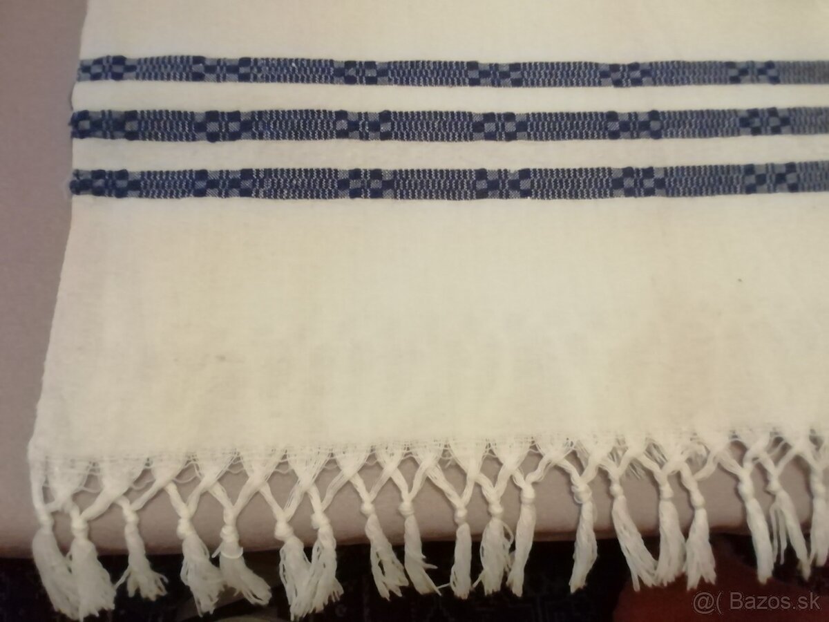 Predáme tkaný ozdobný starožitný prehoz rozmer 180cm x 50cm + 5+5cm strapce z oboch strán, vytkaná modrá vzorka.