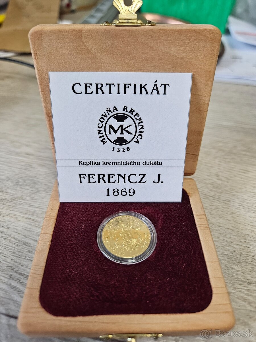 Replika kremnického dukátu František Jozef I. 1869,zlato Au 986, váha 4.6g, prevedenie lesklé, limitovaný náklad 100 ks, číslo 065, Mincovňa Kremnica. Osobný odber alebo platba vopred+ poistená zasielka