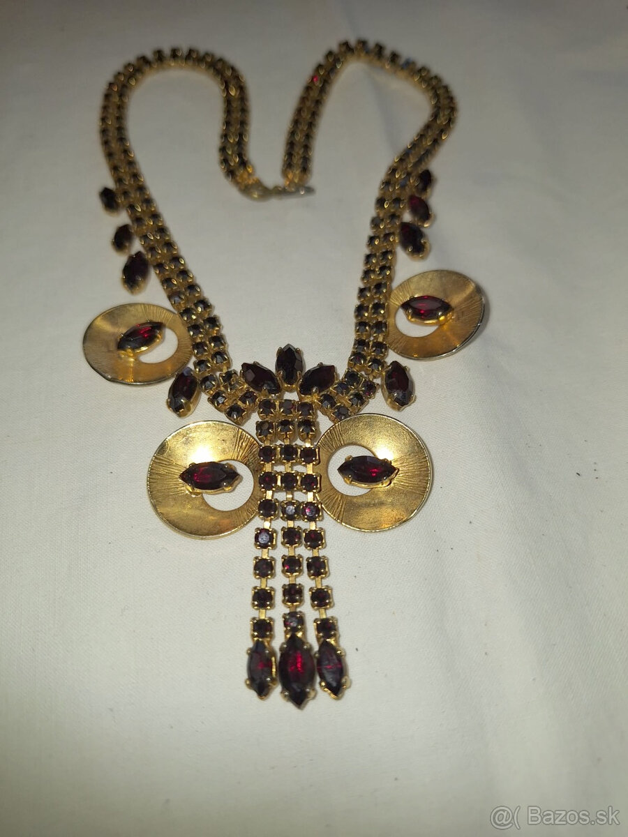 krásny starý náhrdelník, Jablonec 60-70 te roky, kov v zlatej farbe, sem tam vidno vek, granátové sklo, zapínanie nie je pôvodné,krásny , elegantný kúsok
