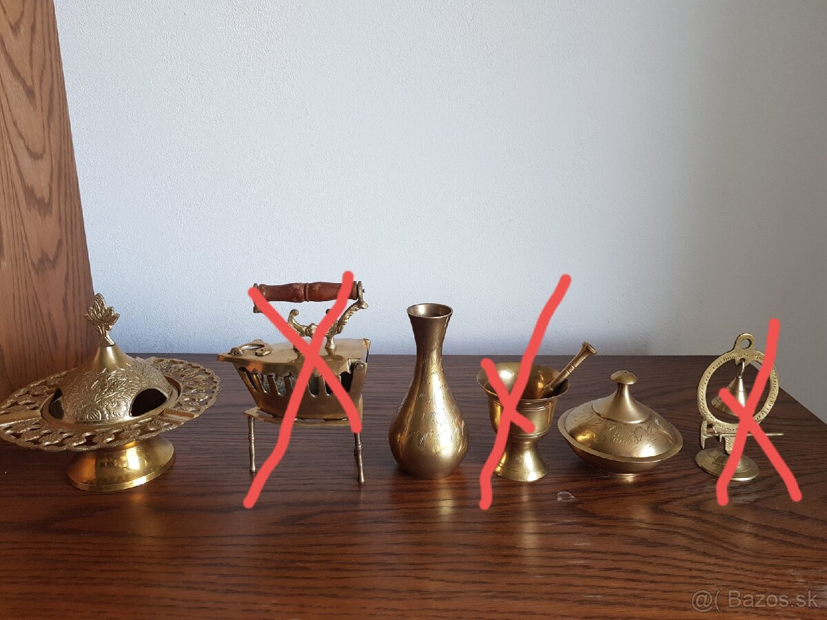 Predám dekoratívne predmety z mosadze: popolník-kadidelnica s vekom 15cm , váza 13cm, nádoba s guľatým vekom 8cm . Cena: popolník 6eur. Váza a nádoba po 4eur+poštovné, príp. osobný odber.