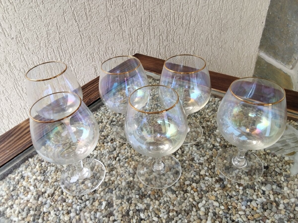 Koňakove sklenené poháre 6 ks nepoškodené so zlatým lemom