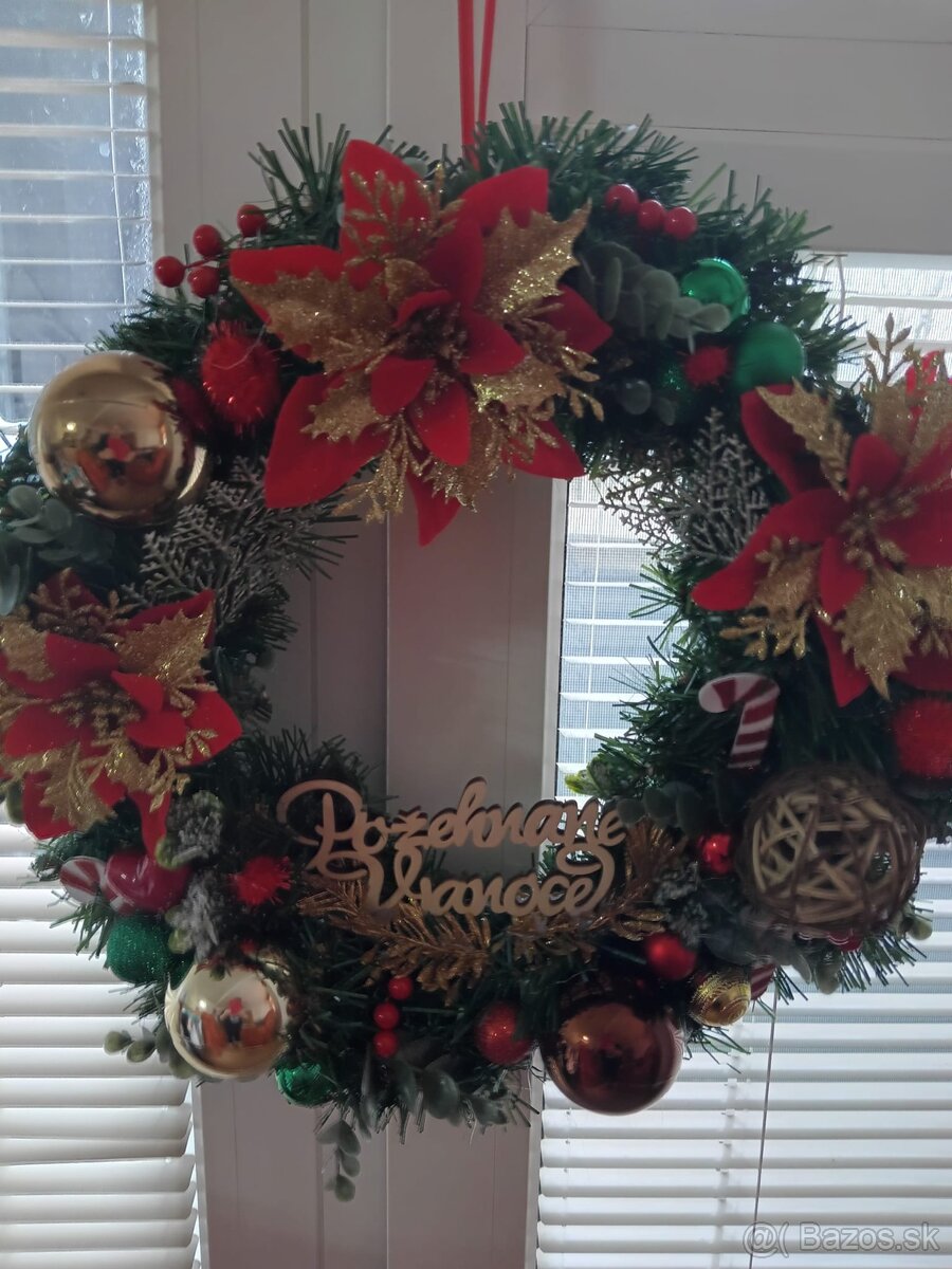PREDAM,,,veniec na dvere s vianočnymi ružami a napisom Požehnane Vianoce,,,priemer 38cm,,,Cena 25e už aj s poštovnym,,PLATBA VOPRED NA UCET NA DOBIERKU NEPOSIELAM