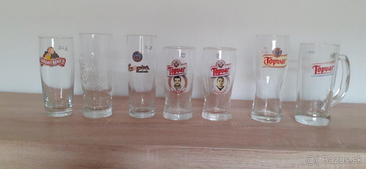 Predám pivové poháre o objeme 0,5 l. 1ks smädný mních, 1 ks radegast 1 ks budweiser budvar, 1ks topvar, 1 ks topvar s portrétom Ľubomír Višňovský, 1 ks topvar s portrétom Dárius Rusnák, 1 ks krígeĺ topvar. Cena za kus 2,50€. Cena za všetky 17, 50 €
