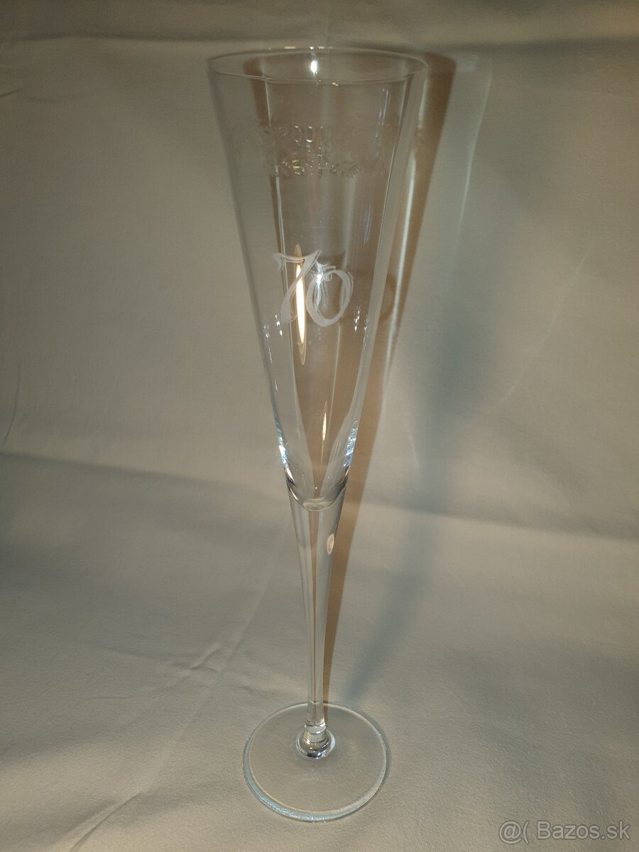 Prevedenie : pohár na šampanské / sekt / šumivé víno, flautový tvar, číre sklo, na tele pohára vygravírovaná dvojica číslic “70“