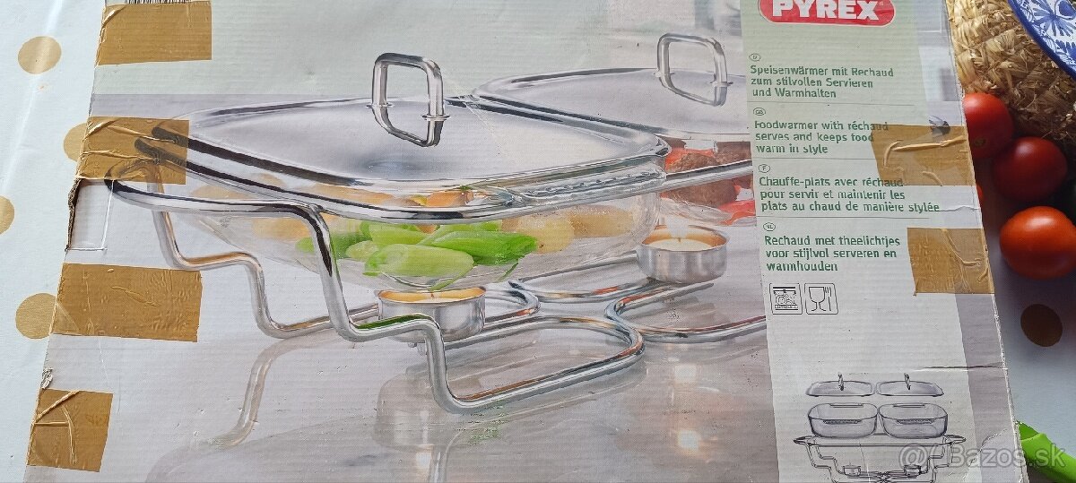 Ohrievač jedál s ohrievacím podstavcom,skleneným nádobami, na štýlové servírovanie a ohrievanie jedál pomocou sviečok
