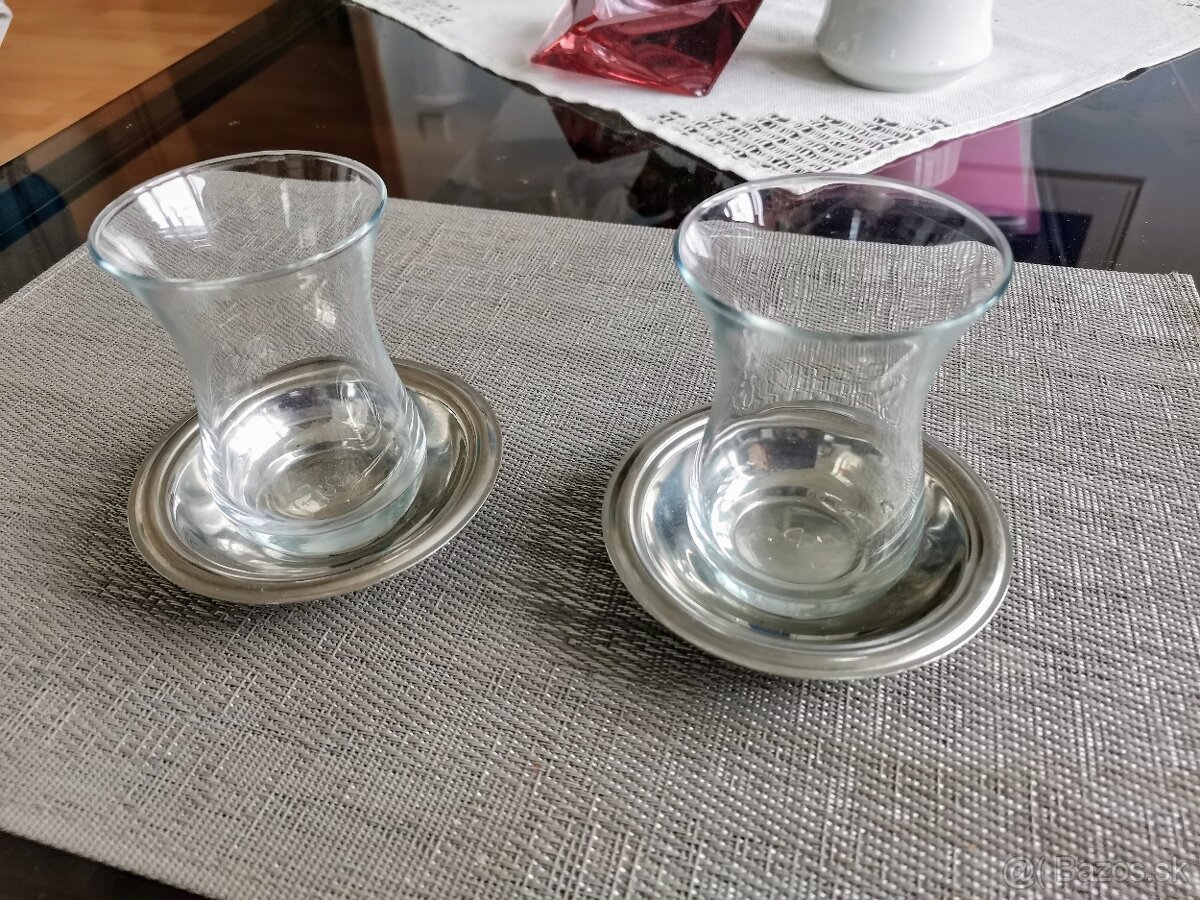 Poháre na čaj z vareného skla s podšálkami z nehrz. ocele, dovezené z dovolenky z Turecka pre servírovanie čierného tureckého čaju.
