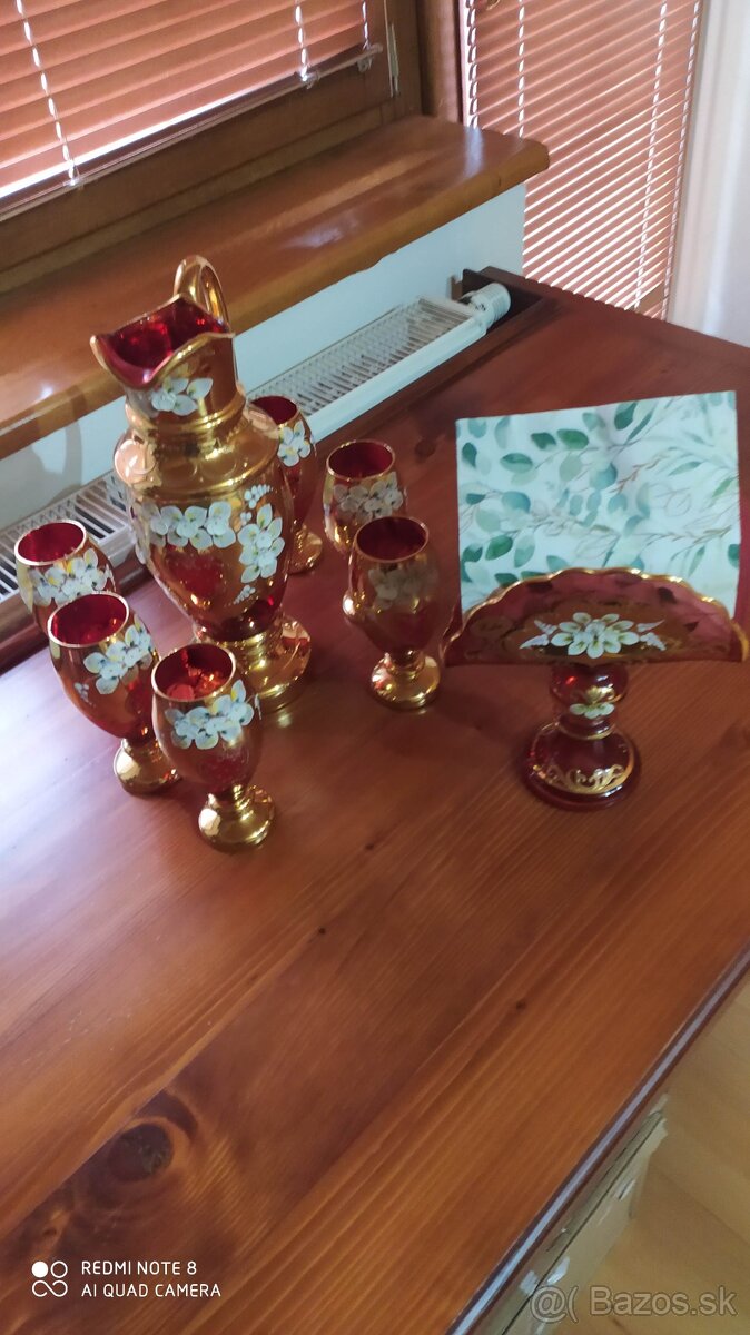 Borské sklo : Krčah, 6 kusov pohárov a servítovník, nepoškodené, pozlátené, ručná práca. Cena 170 EUR. Krásny darček ku každej príležitosti.