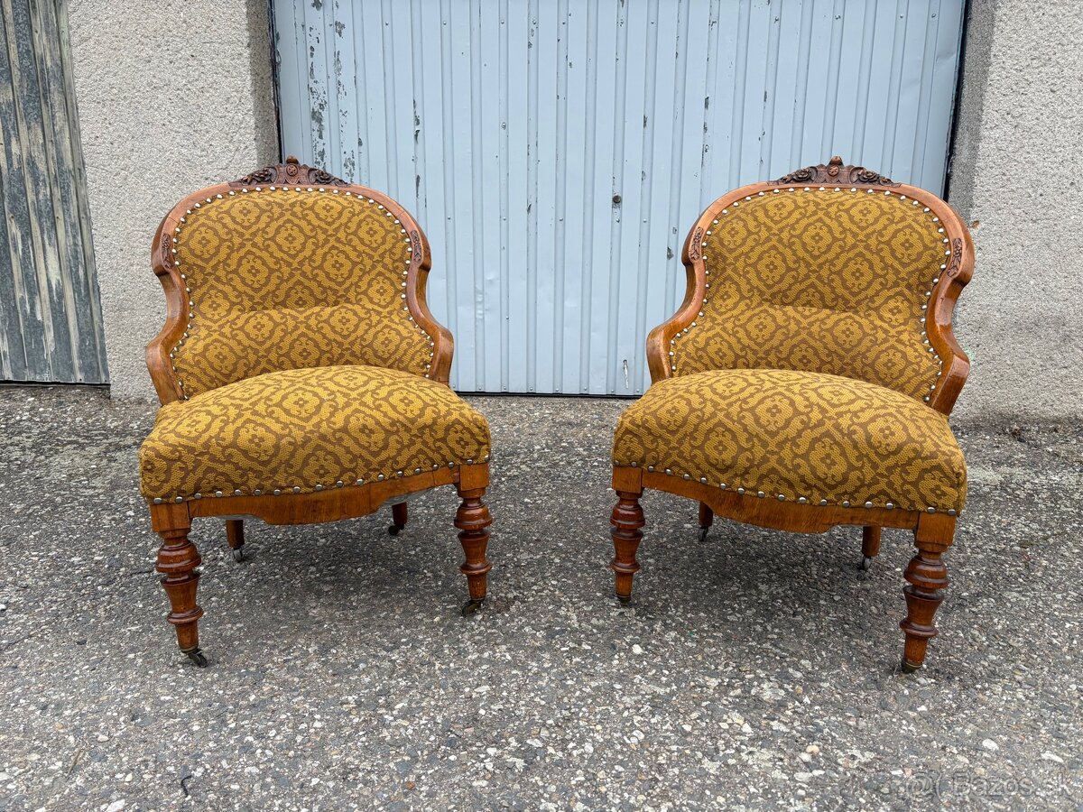 Prodám dvě starožitná křesla, z roku přibližně 1900. Jedna se o původní stav včetně čalounění