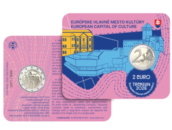 Coincard 2€ Trenčín EHMK 2026 - [28.3. 2026]Ponúkam na predaj zberateľskú kartu s mincou 2 Euro Trenčín - Európske hlavné mesto kultúry 2026.