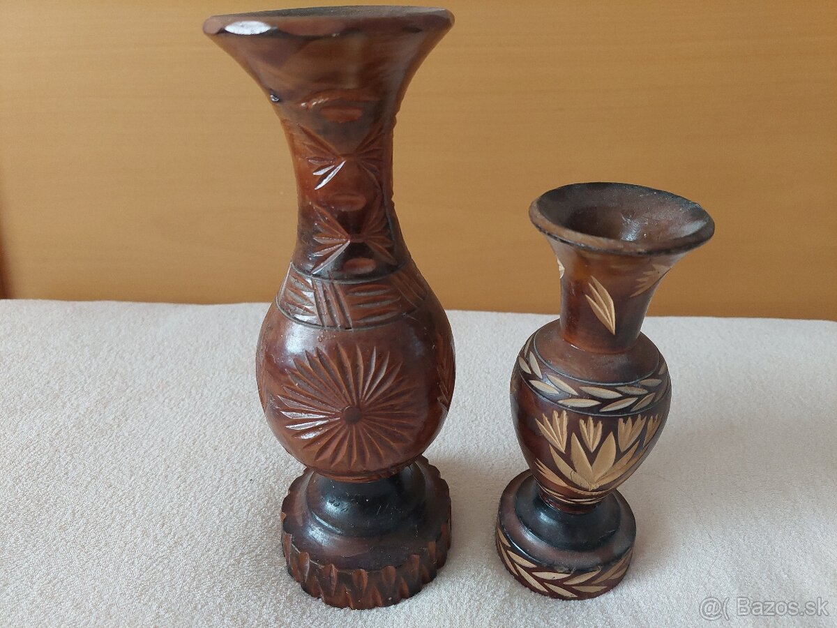 Predám 2ks ručne vyrezávané vázy: vyššia23cm-5e, nižššia 17cm-4e.Vhodné na chalupu ako dekorácia.