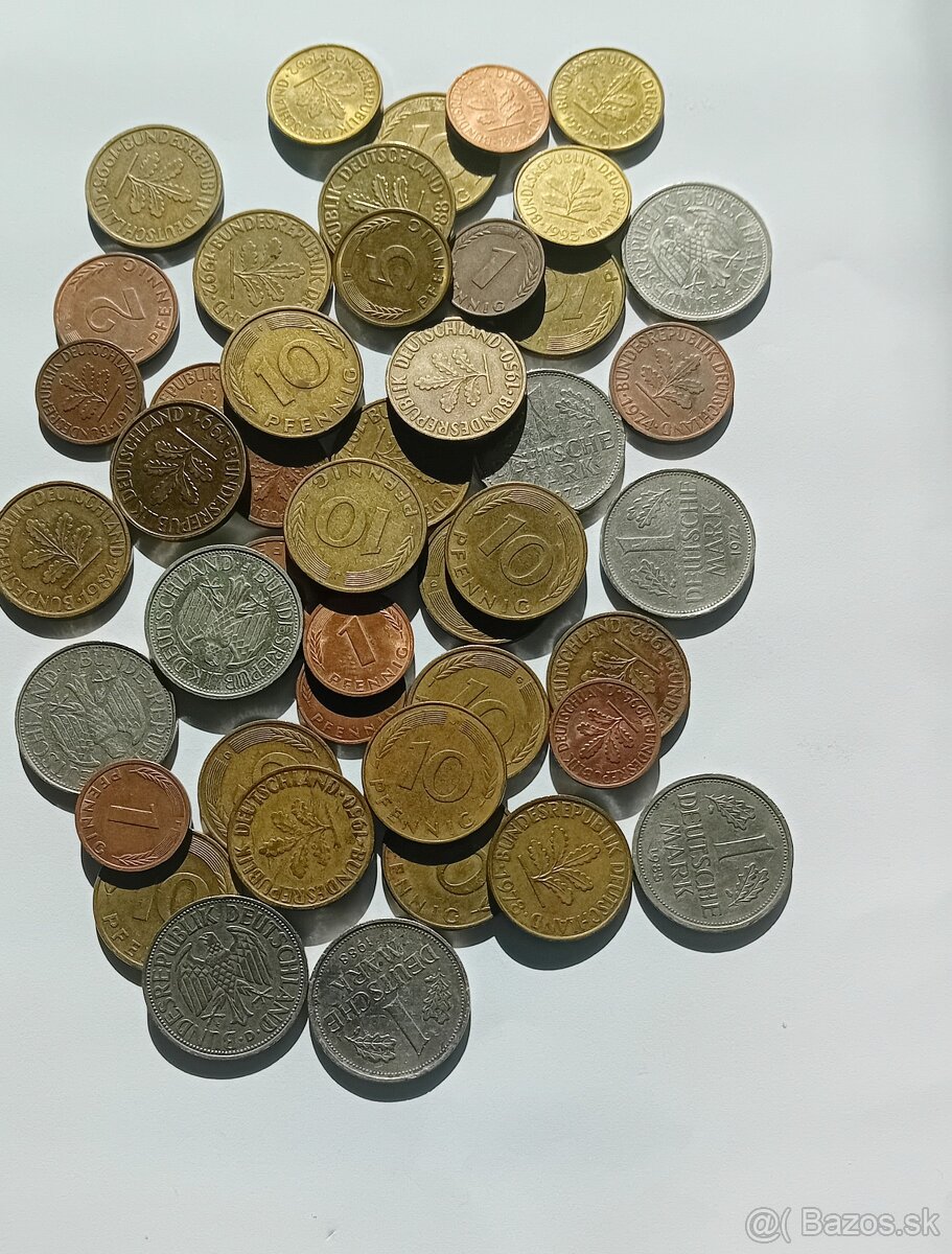 45 ks mincí Nemecko / NSR + Fed. Republika/ od r. 1949-1995, rôzne ročníky, rôzne nominály, cena 7 eur a 33 ks mincí NDR, rôzne ročníky, rôzne nominály, cena 3 eurá.