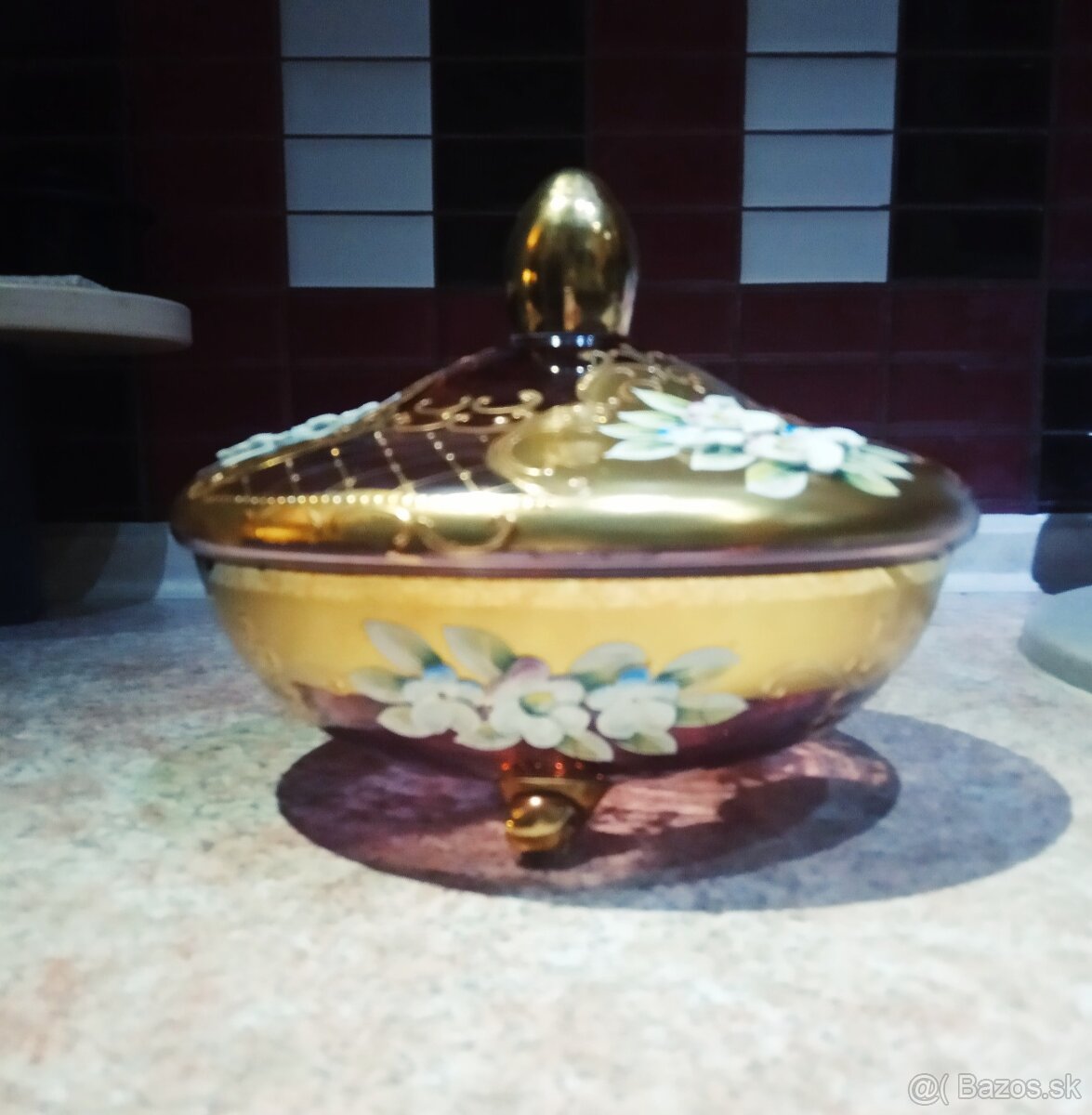Rubinova doza Novoborske sklo 16cm x 22cm bohato zlacena,vysoky smalt.