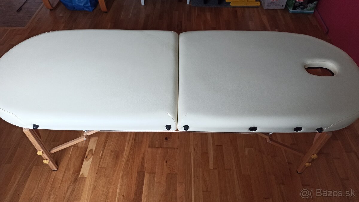 Skladací, ale pevný drevený masážny stôl so zaoblenými rohmi značky Restpro, používaný minimálne iba na domáce masáže v rámci rodiny. Dĺžka 190, šírka 70 v rozloženom stave. Nepoškodený. Cena nového cca 180€. Detailné informácie je možné nájsť na internete. Nemám k tomu doplnkovú výbavu, predáva sa tak, ako je na obrázkoch. Prosím iba volať.