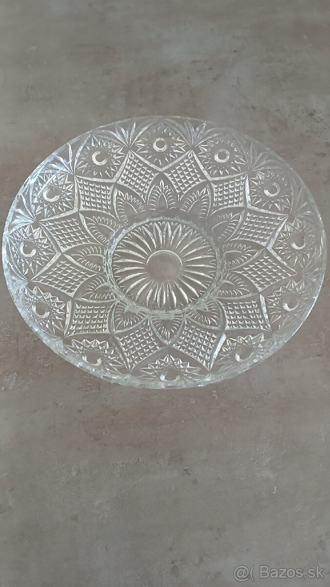 Sklenena misa - [14.3. 2026]Staršia misa z číreho skla s vybrusovanym dekorom. Výška 7 cm, priemer 20 cm.