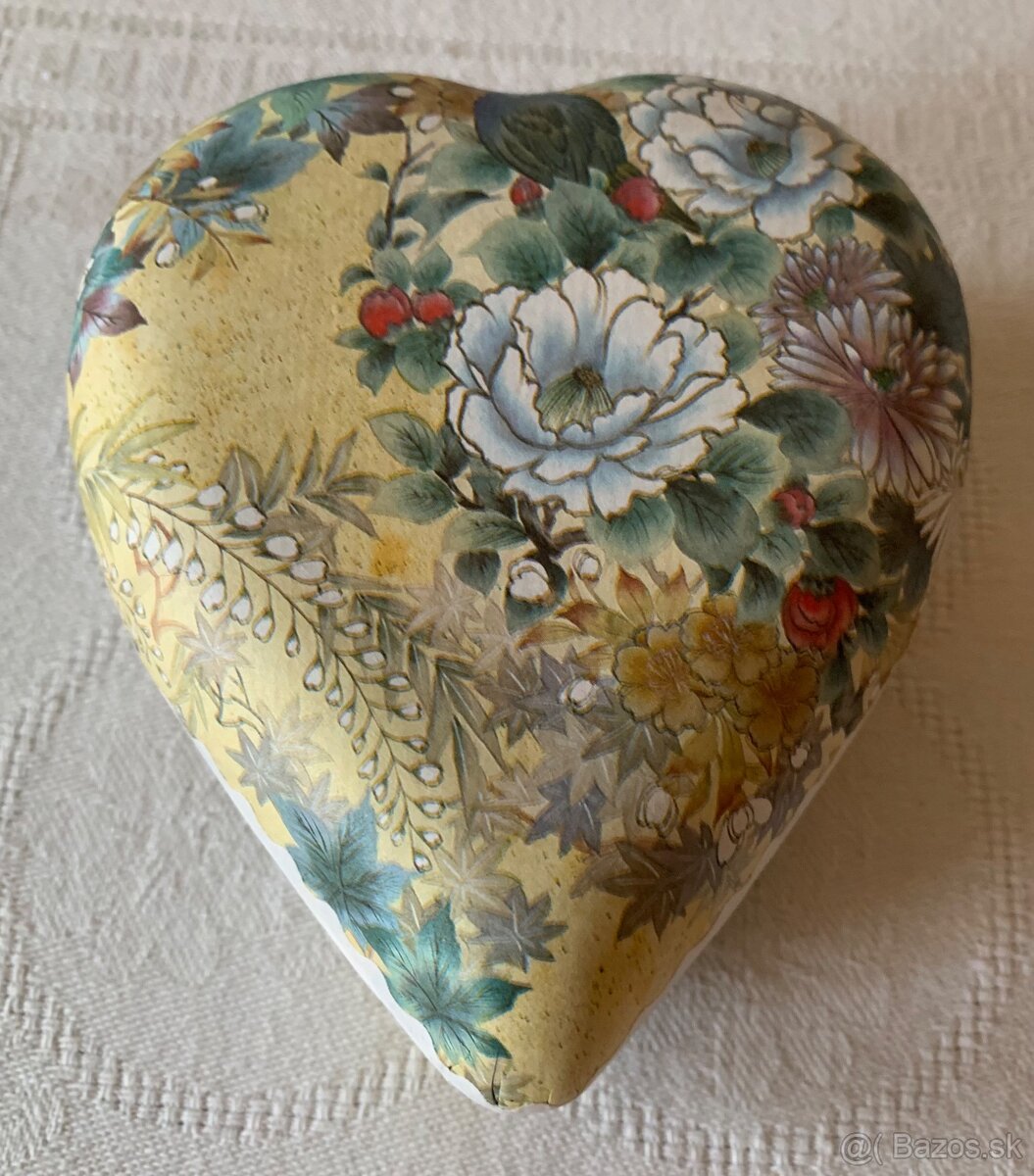 Predám krásnu papierovú krabičku v tvare srdca s jemným kvetinovým motívom. Krabička je otvárateľná, vo vnútri zdobená zeleným vzorom. Je ideálna na darčeky, šperky alebo ako vkusná veľkonočná/jarná dekorácia. Ide o úplne nové kusy z výpredaja skladových zásob.