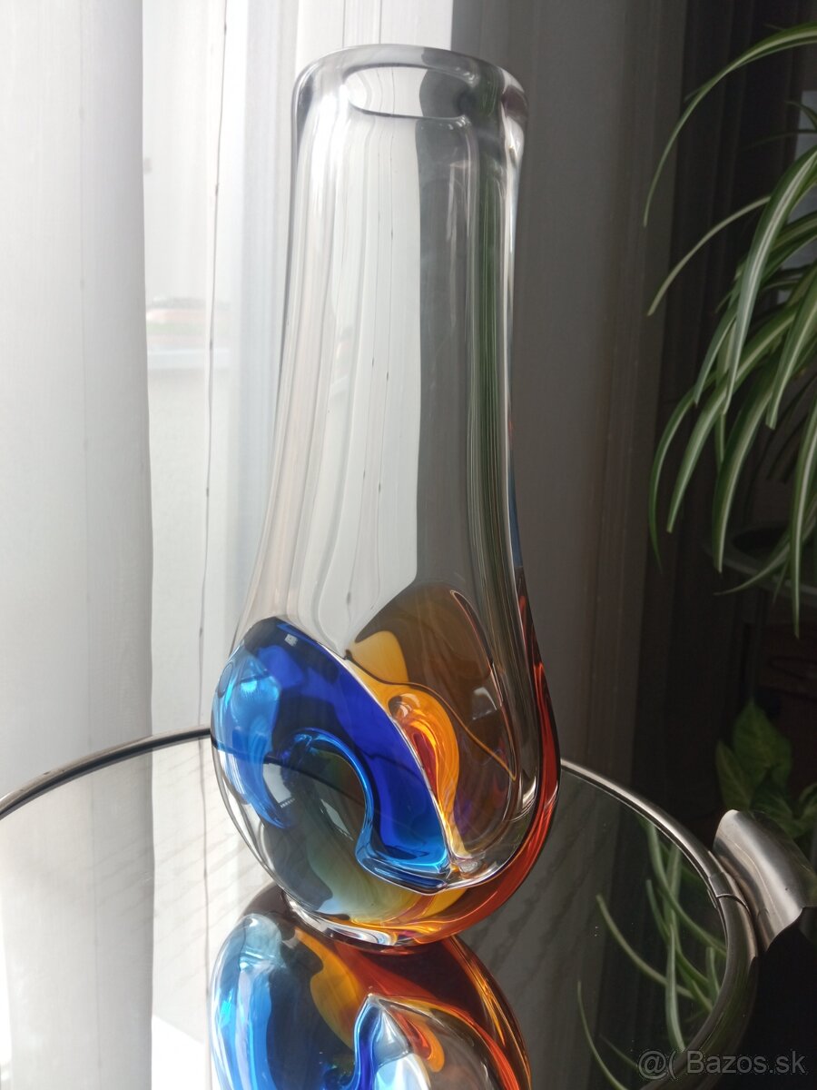 Váza z hutného skla Metelák/Lípa 1967, v perfektnom stave bez oťukov a škrabancov, vzácny kúsok výška 24 cm váha 1.5 kg, na čírom skle je nastavený kruhový ornament ambrovej a modrej farby naspodku s prienikom zo všetkých strán vytvára krásne efekty