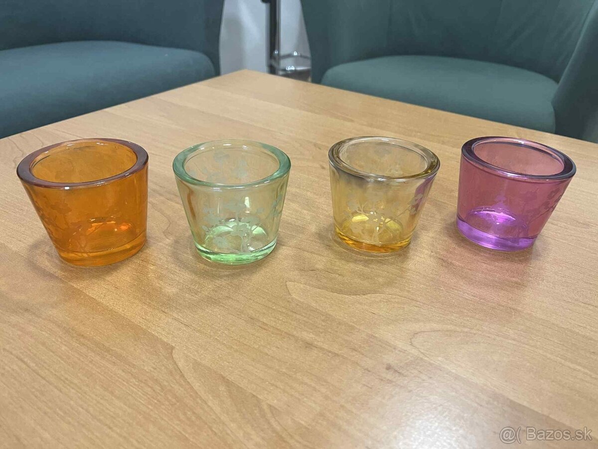 Predám 4 ks sklenené svietniky v jarných farbách bez poškodenia, hrubé pevné sklo. Cena za 4 ks je symbolická 2 €.