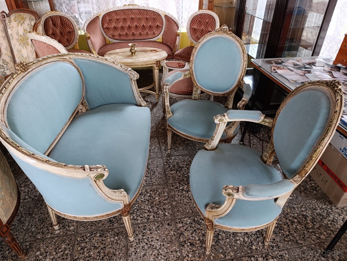 Predám dobové sedenia.Modré dvoj kreslo a 2 kreslá.Ružové dvoj kreslo,2 kreslá a 2 stoličky so stolíkom s onyxom.Ružové 600.Do zimnej záhrady,salónu či čakárne.
