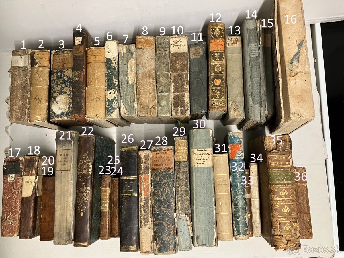 Predám starožitné knihy, rok vydania 1600 - 1700, latinské a nemecké niektoré vydané v Bratislave - Posonii. Knihy sú číslované + prvý údaj rok vydania pod ním počet strán. Rok vydania + počet strán + ceny sú uvedené na obrázkoch. Cena: od 30.- Euro za kus.