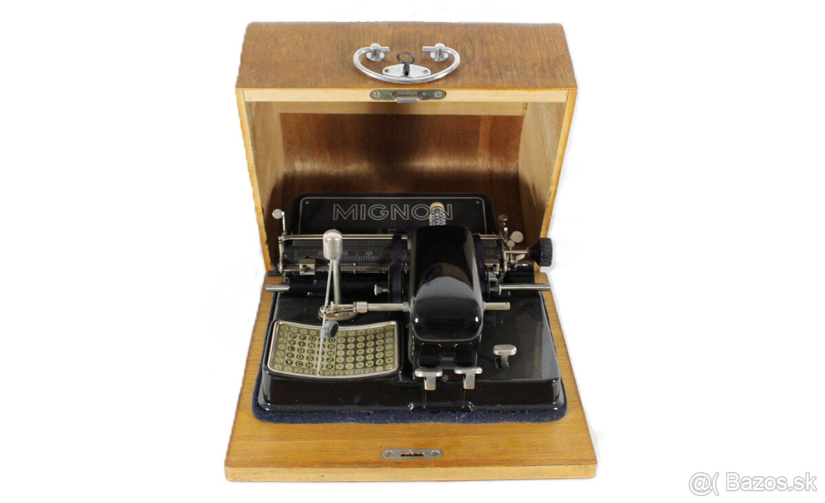 ponúkam na predaj starožitný písací stroj AEG Mignon z roku 1923.písací stroj je v top stave,viďfoto,s pôvodným dreveným krytom.netradičný mechanizmus písania predstavuje jeden z mnohých technických patentov začiatku dvadsiateho storočia.osobné prevzatie v okrese Topoľčany.na prípadné dotazy rád zodpoviem.kontaktujte ma prosím cez formulár,číslo je vymyslené.ďakujem