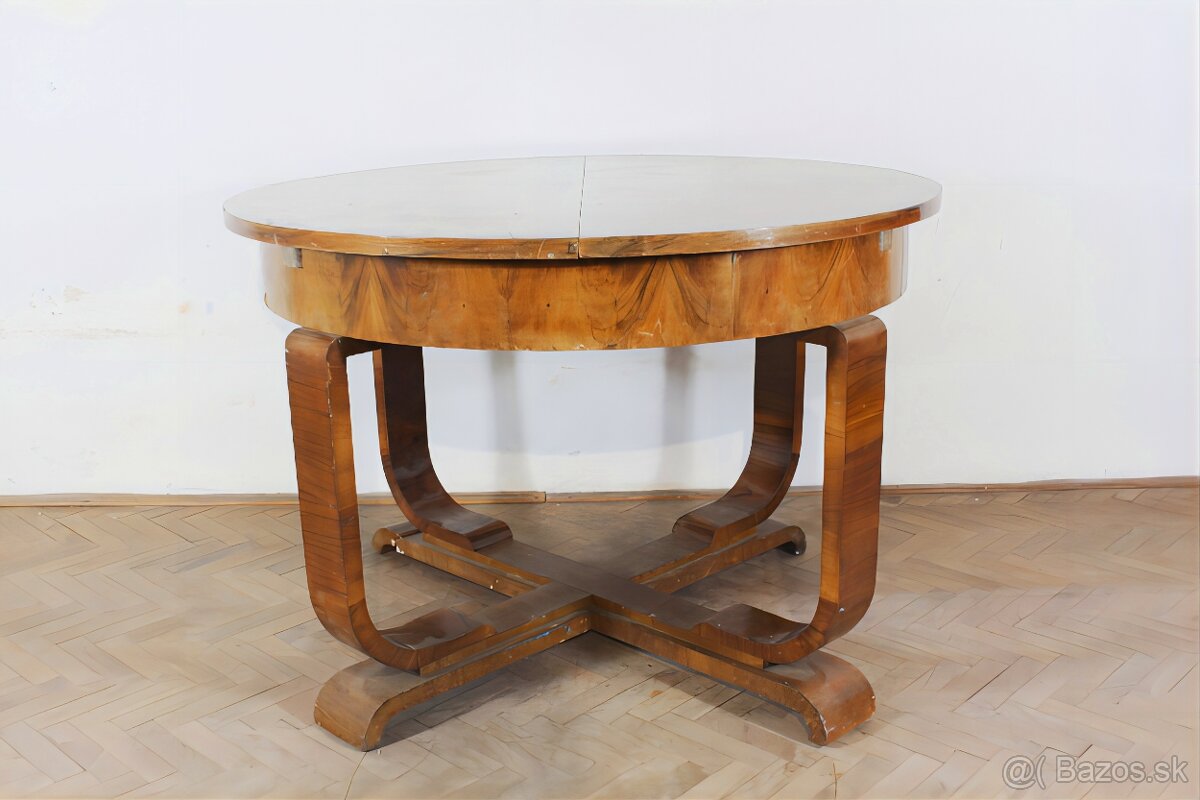 ponúkam na predaj výnimočný art deco jedálenský stôl,určený na renováciu.dýha s nádhernou kresbou je orechová korenica,stôl je rozkladací so vstavaným systémom rozloženia.po reštaurovaní bude stôl hodnotným a veľmi luxusným originálnym kusom nábytku zo začiatku tridsiatych rokov dvadsiateho storočia.stav viď foto.poškodenia dýhy,rozťahovacieho mechanizmu a ulomená nožička.výška je 75 cm a priemer vrchnej dosky je 110 cm.osobné prevzatie v okrese Topoľčany.na prípadné dotazy rád zodpoviem.kontaktujte ma prosím cez formulár,číslo je vymyslené.ďakujem