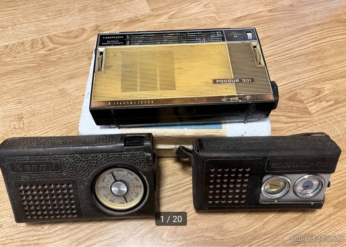 Predám tieto staré sovietske rádiá. Všetky po vložení bateriek šuštali a dalo sa na nich ladiť. Radio Rossija 301 má origo obal, návod aj paragón (stálo 799 Kčs), rádio Signál má funkčné hodinky aj mechanizmus ich spúšťania, chýbajú mu však dva spojovacie šróby a kryt baterky, ale obal ho drží pokope (pre istotu som aj ukázal ako vyzerá po roztvorení). Rádio Kvarc je komplet a šuští…