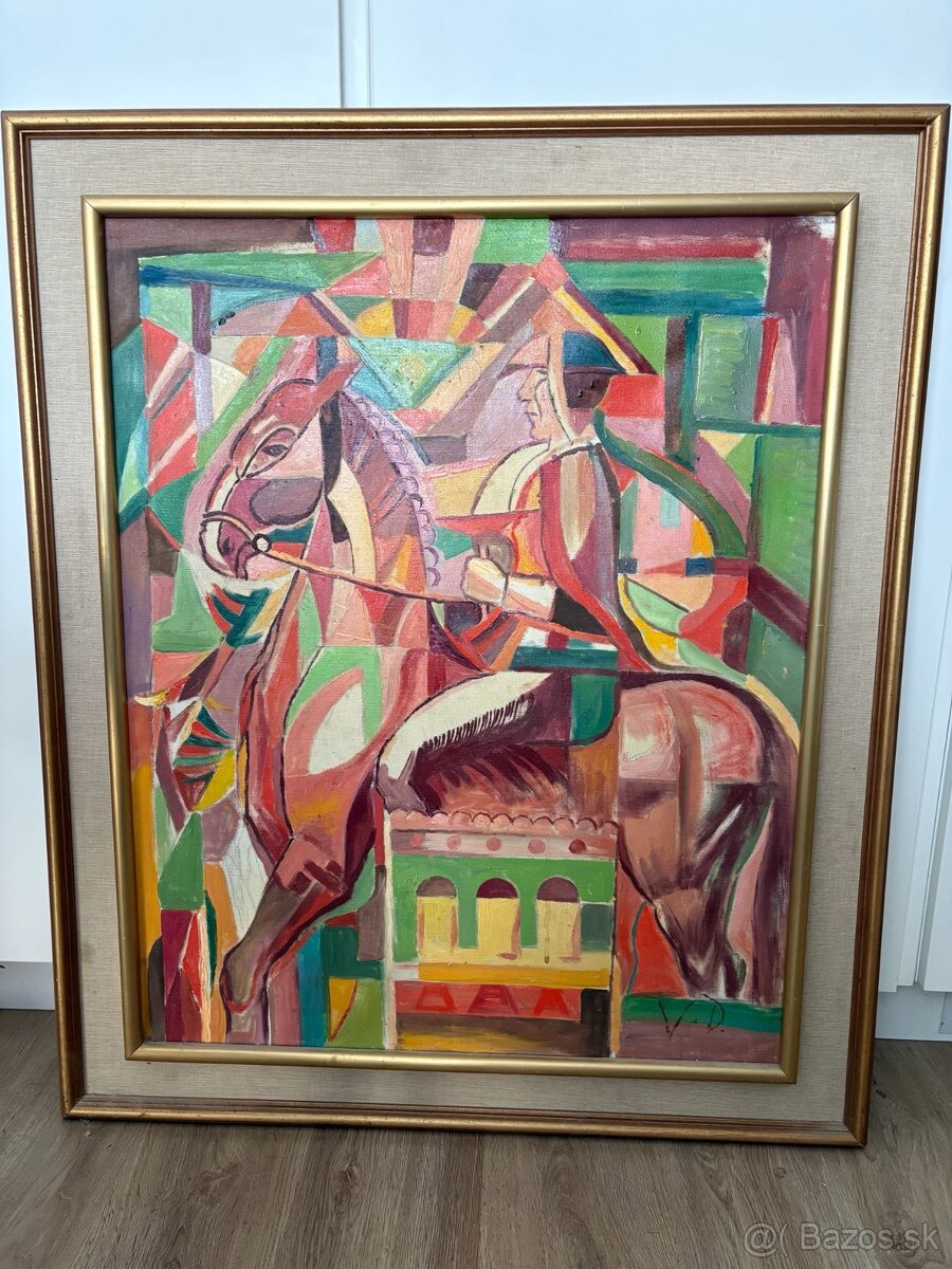 Predám signovanú olejomaľbu od autora V. Droppu s názvom "Jazdec" (1985). Dielo je ladené do kubistického štýlu s výraznou farebnosťou a dynamikou. Obraz je v masívnom ráme s textilnou paspartou.