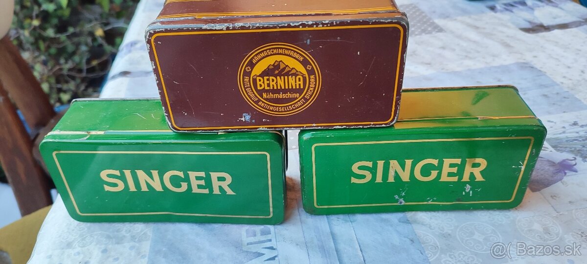 Staré plechové krabičky Singer,Bernina k šijací stroj, ks 15€ ( pri kúpe spolu 39€), osobne Bratislava Dúbravka alebo Packeta po platbe
