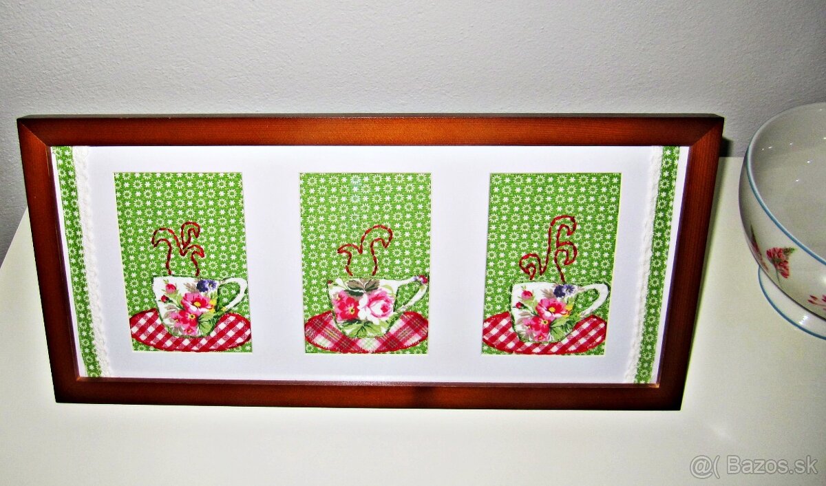 Mám na predaj vidiecky Vintage obraz. V rámiku pod bielou paspartou sú ručne šité tri šálky z látky a prišité na zelenú látku. Rámik má nožičku na opretie. Veľkosť : 50 cm x 23 cm. Poštovné je 6 eur platba vopred na účet. Posielam ako pozor sklo. Je možný aj osobný odber v Nitre. Píšte prosím na e - mail. Osobný odber by bol najlepší.