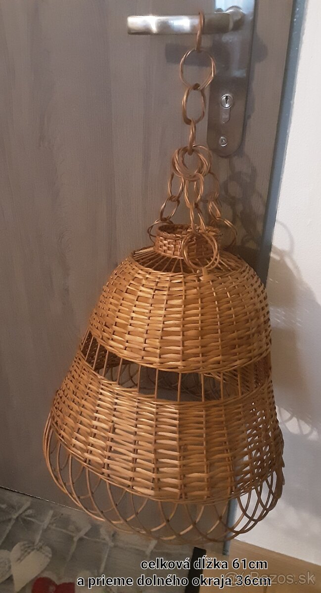 Prútený luster za 10€, keramický luster za 18€, zelenobielý nástenný luster kala za 10€ a žltá stolná lampa s možnosťou povesenia za 13€.