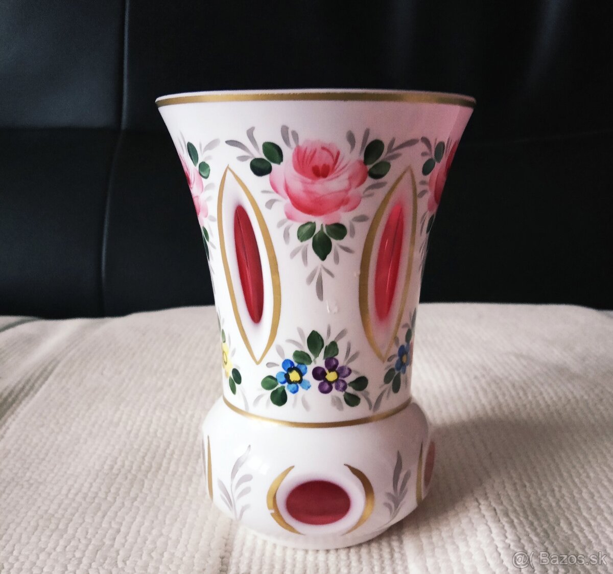 Ruzove sklo prejimane bielym,rucno vybrusovane cocky,dobova malba.Velmi pekny kusok.