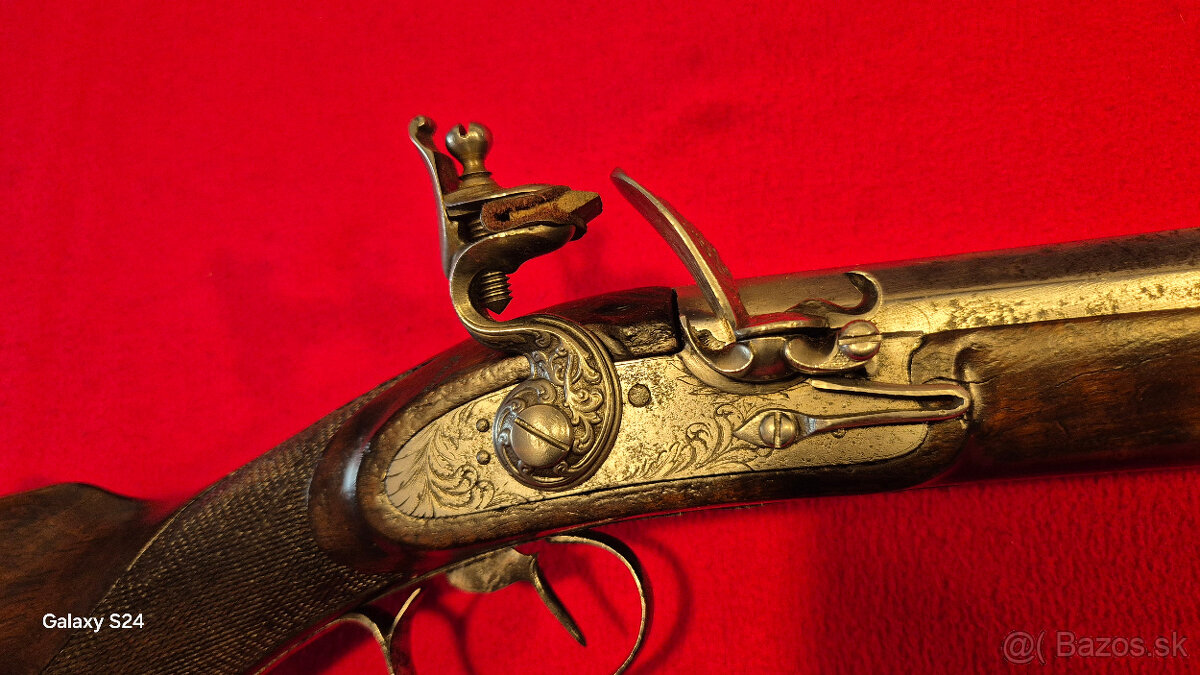 Baroková kresadlová puška, zdobený kresadlový zámok, funkčná, orechové drevo, dĺžka 121cm.