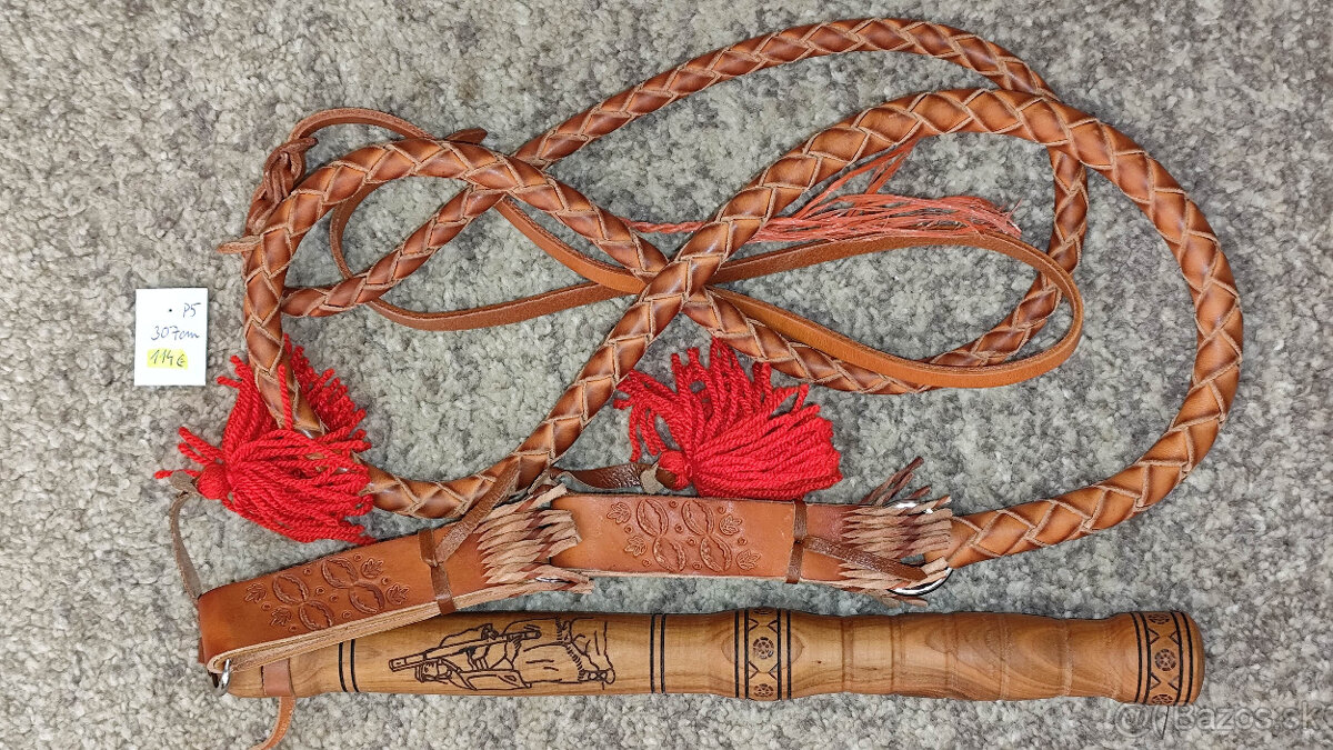 Predám tradičný slovenský ručne robený pastiersky bič z pravej hovädzej kože, alebo vymením za starú koženú žinenku. Bič je ideálne vyvážený a ľahko plieska aj keď sa rúčka drží len 2 prstami. Cena od 50 €, záleží od prevedenia ( bez strapcov, jeden alebo dva strapce ), od dĺžky a od výzdoby rúčok (1-10) a strapcov (A-F). Výzdobu si môžete ľubovoľne nakombinovať. Na rúčku aj možnosť vypálenia vlastných obrázkov a nápisov. Možnosť kúpiť aj samostatne len koženú časť alebo len rúčku.