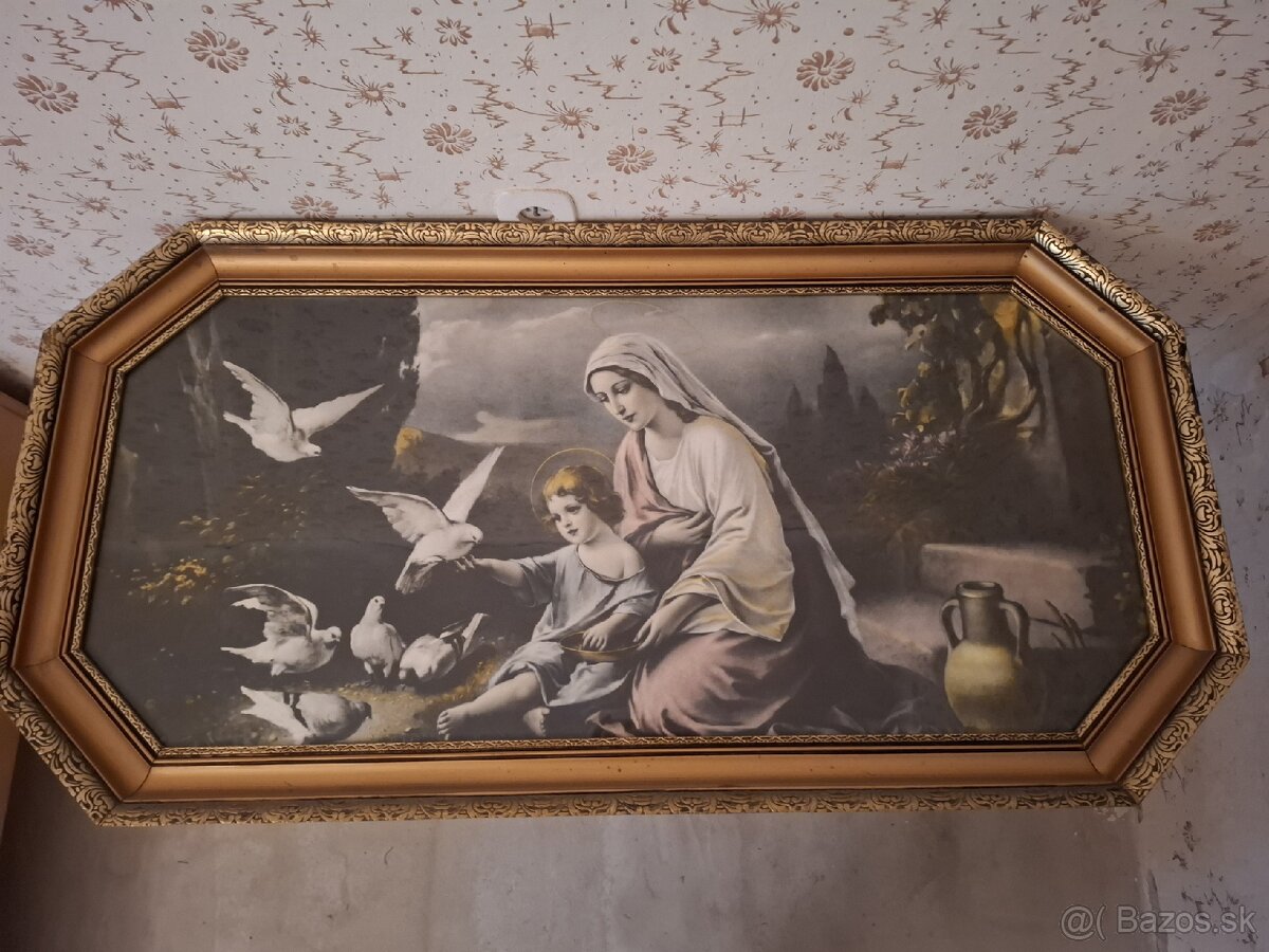 Predám veľký náboženský obraz „Panna Mária s malým Ježišom a holubicami“ v pôsobivom pozlátenom osemuholníkovom ráme so zdobeným ornamentom.