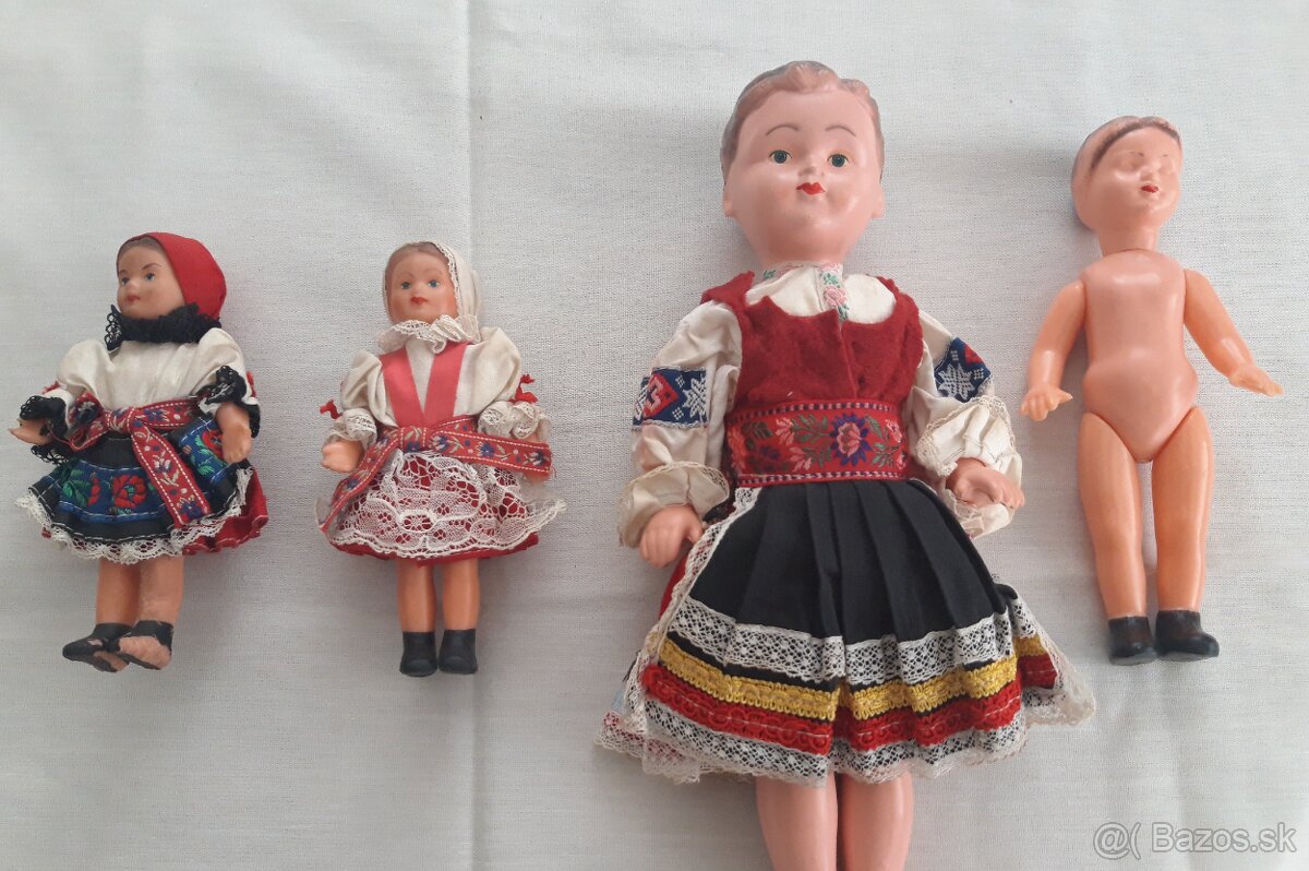 Predám 4 bábiky - dve malé v kroji výška 15 cm, veľká v kroji 30 cm, stredná bez oblečenia 20 cm. Nálezový stav, nie sú prasknuté, jedna malá má poškodenú ľavú nohu - viď detail.