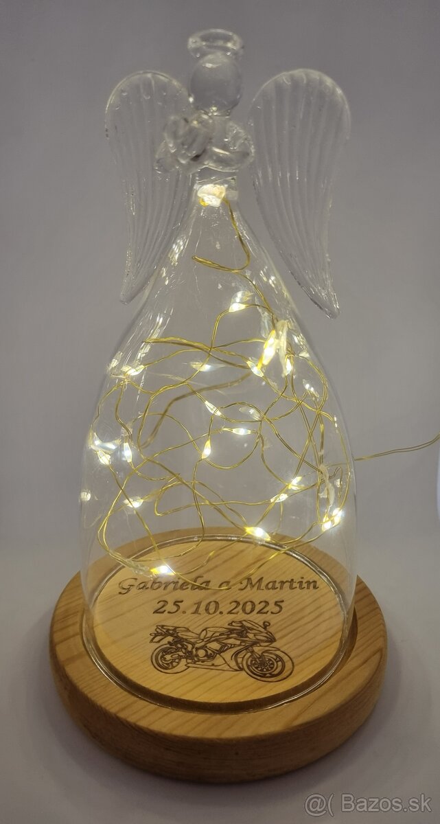 Sklenený anjel s dreveným podstavcom so svietielkami